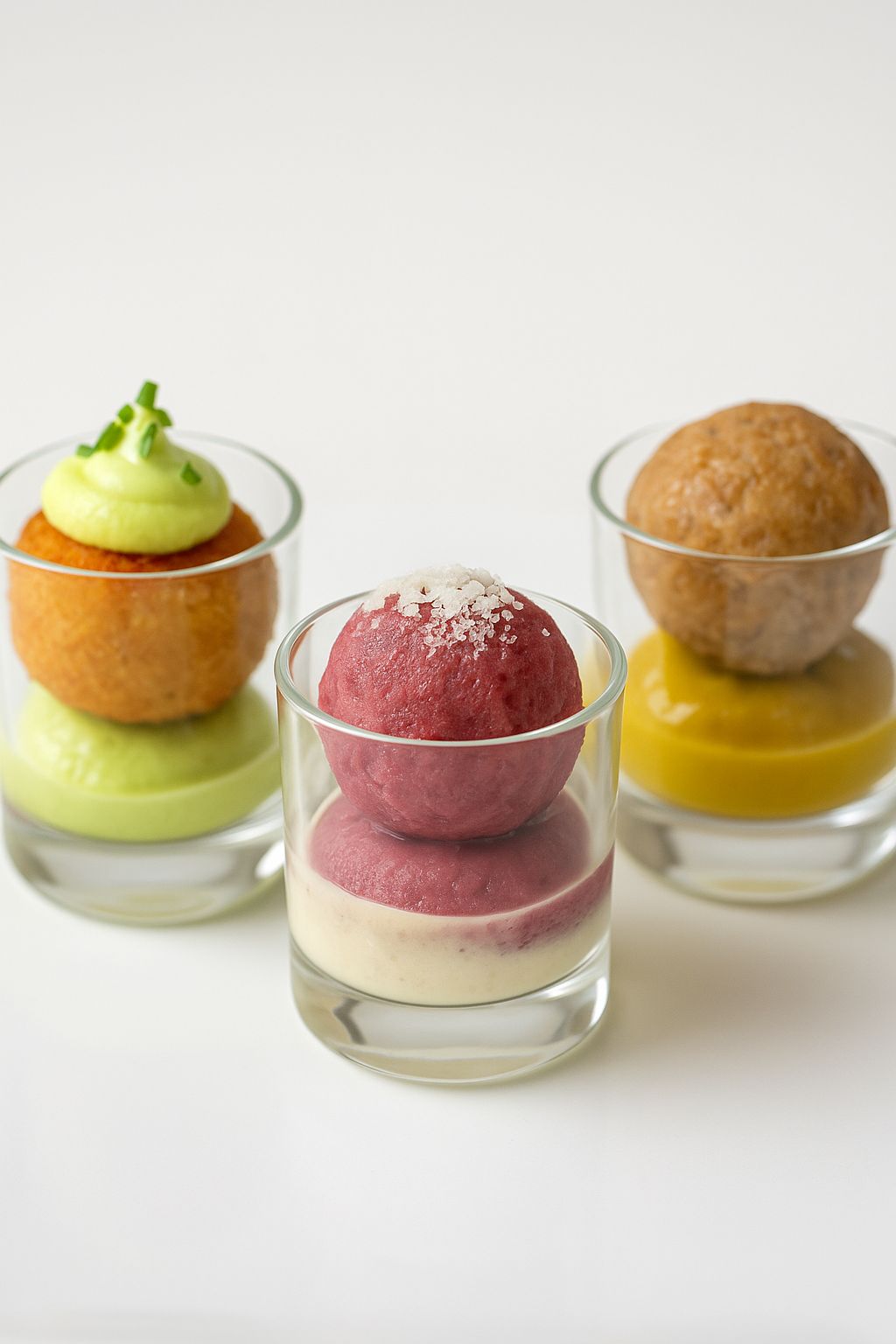 Piccole Sfere delle Feste – Tris di polpette tra mare, terra e montagna ispirati ai contrasti delle Feste: la delicatezza del baccalà, la dolcezza speziata della vitella e